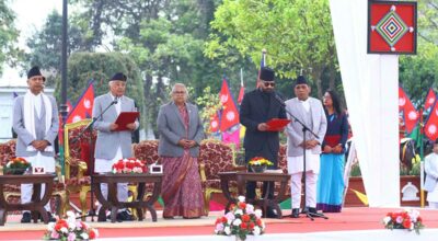काठमाडौँ,चैत १३ — बालेन्द्र शाहले प्रधानमन्त्री पदको शपथ लिएको लगत्तै मन्त्रिपरिषद्का १५ जना मन्त्रीहरूले पनि पद तथा गोपनीयताको शपथ लिनुभएको छ। राष्ट्रपति भवन शीतल निवासमा आयोजित विशेष समारोहमा रामचन्द्र पौडेलसमक्ष नवनियुक्त मन्त्रीहरूले शपथ लिनुभएको हो। मन्त्रिपरिषद्मा स्वर्णिम वाग्ले अर्थमन्त्री, सुदन गुरुङ गृहमन्त्री, शिशिर खनाल परराष्ट्रमन्त्री,