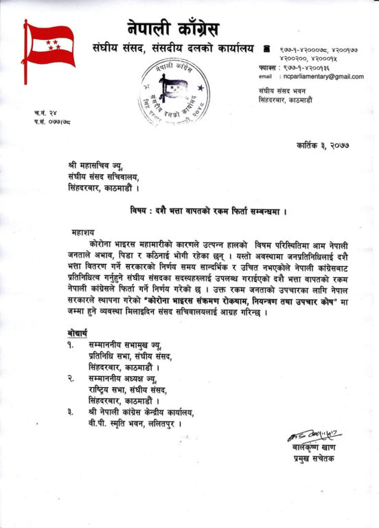 कांग्रेस सङ्घीय संसदीय दलका नेतासमेत रहेका सभापति देउवाले सांसदहरुको दशैँ खर्च सरकारले कोभिड–१९ सङ्क्रमणको उपचार र व्यवस्थापनमा खर्च गरोस् भनेर फिर्ता गर्नका लागि सोमबार बिहान निर्देशन दिएका हुन् । कांग्रेस संसदीय दलको बैठकले पछि अनुमोदन गर्ने गरी सभापति देउवाले दिनुभएको निर्देशनबमोजिम आजै सबैलाई पत्राचार गरिने पार्टीका प्रमुख सचेतक बालकृष्ण खाँणले जानकारी दिए ।