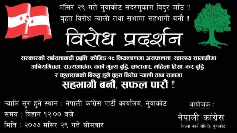 नुवाकोट मंसिर २५ । नेपाली कांग्रेस जिल्ला कार्यसमिति नुवाकोटले यही मंसिर २९ गते सरकारविरुद्ध प्रदर्शन गर्ने भएको छ ।
