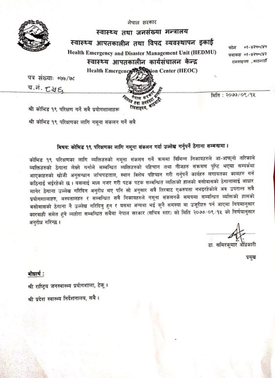 स्वास्थ्य तथा जनसंख्या मन्त्रालयले कोभिड—१९ परीक्षण गर्ने व्यक्तिहरुको सही ठेगाना संकलन गर्न अस्पताल तथा प्रयोगशालाहरुलाई निर्देशन दिएको छ ।