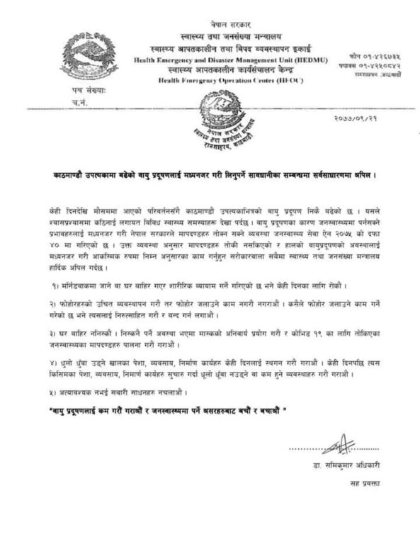 मन्त्रालयले मंगलबार साँझ विज्ञप्ति जारी गर्दै केही दिनदेखि मौसममा आएको परिवतनसँगै काठमाडौं उपत्यकामा वायु प्रदूषण बढेकाले श्वासप्रश्वासमा कठिनाई लगायत विविध समस्या आउन सक्ने भन्दै सचेत गराएको हो । सकेसम्म घरबाहिर ननिस्कन मन्त्रालयको आग्रह छ ।