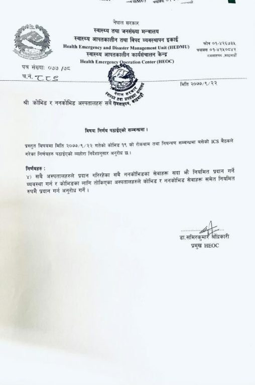 सरकारद्वारा सबै कोभिड अस्पतालहरूलाई ननकोभिड सेवा पनि सञ्चालन गर्न निर्देशन