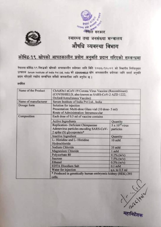 विभागको शुक्रबार बसेको बैठकले खोपको आपत्कालिन प्रयोगका लागि अनुमति दिएको सूचना अधिकारी सन्तोष केसीले जानकारी दिए । योसँगै ‘कोभिसिल्ड’ नेपालमा आपत्कालिन प्रयोगको अनुमति पाउने पहिलो कोभिड–१९ विरुद्धको खोप बनेको छ ।