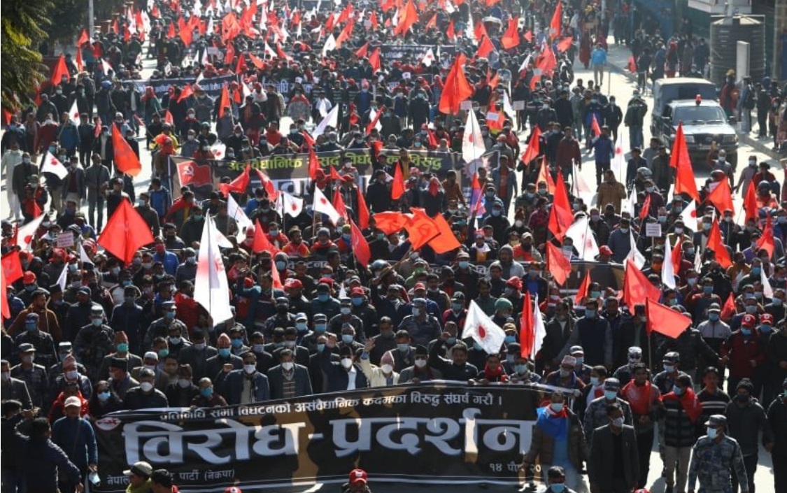 काठमाडौ,माघ ९ । नेपाल कम्युनिष्ट पार्टी (नेकपा) पुष्पकमल दाहाल–माधवकुमार नेपाल समूहले जुलुसलाई मर्यादित बनाउँदै निर्धारित नारा मात्र लगाउनुपर्ने निर्देशिका जारी गरेको छ । प्रतिनिधिसभा विघटनको विरोधमा हुने जुलुसलाई मर्यादित बनाउन केन्द्रीय संघर्ष समितिले नारा निर्धारण गरेको हो ।