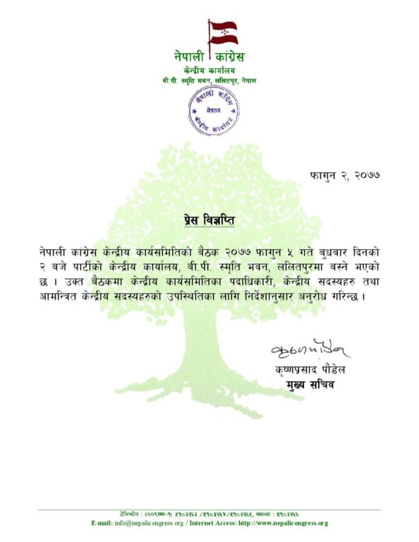 ‘नेपाली कांग्रेस केन्द्रीय कार्यसमितिको बैठक २०७७ फागुन ५ गते बुधबार दिनको २ बजे पार्टीको केन्द्रीय कार्यालय, बी.पी. स्मृति भवन, ललितपुरमा बस्ने भएको छ । उक्त बैठकमा केन्द्रीय कार्यसमितिका पदाधिकारी, केन्द्रीय सदस्यहरु तथा आमन्त्रित केन्द्रीय सदस्यहरुको उपस्थितिका लागि निर्देशानुसार अनुरोध गरिन्छ ।’ जारी विज्ञप्तीमा भनिएको छ।