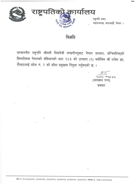 नेपालको संविधानको धारा १६३ को उपधारा (२) बमोजिम झालाई प्रदेश प्रमुखमा नियुक्त गरेको राष्ट्रपति कार्यालयका प्रवक्ता जगन्नाथ पन्तले जानकारी दिए ।