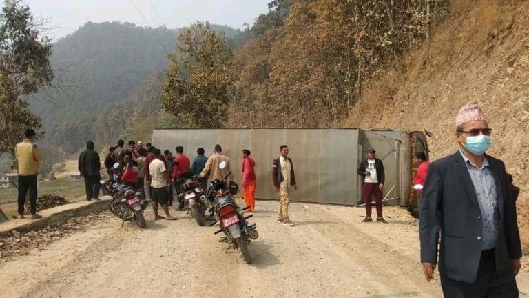 नुवाकोटको लिखुमा मालबाहक गाडी पल्टिँयो