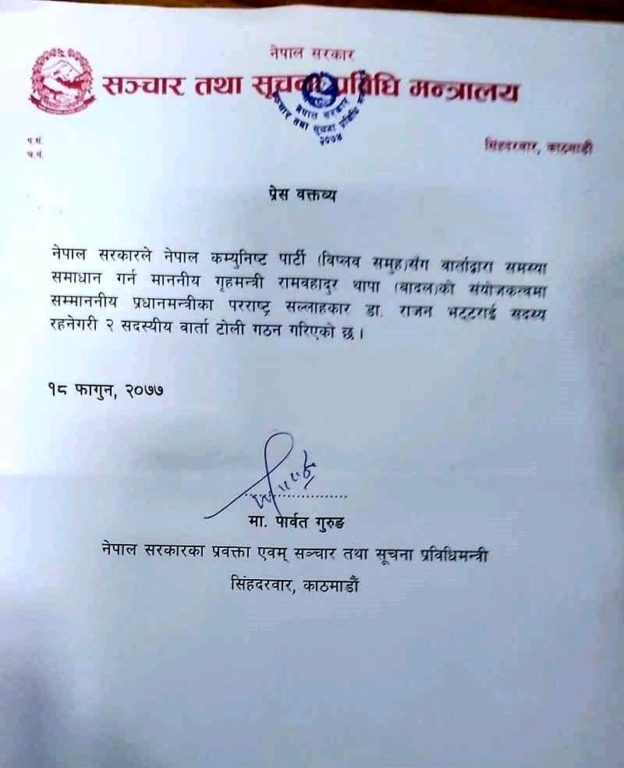 नेपाल सरकारका प्रवक्ता एवम् सञ्चार तथा सूचना प्रविधिमन्त्री पार्वत गुरुङले केही बेरअघि जारी गर्नुभएको प्रेस विज्ञप्तिमा वार्ताटोली गठन गरिएको जनाइएको छ ।