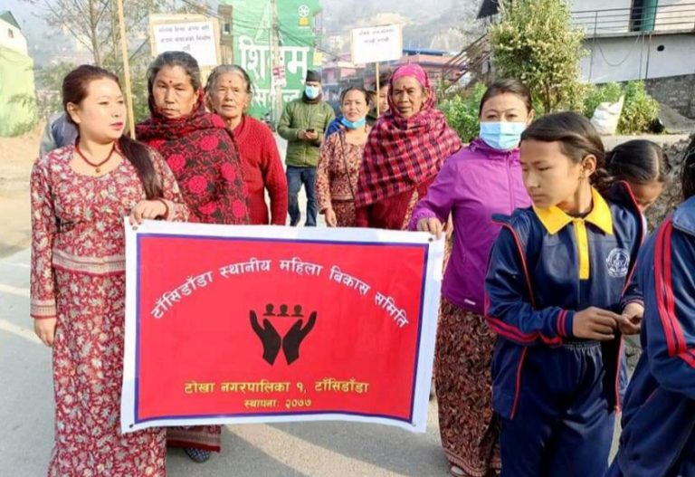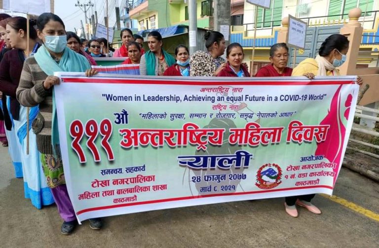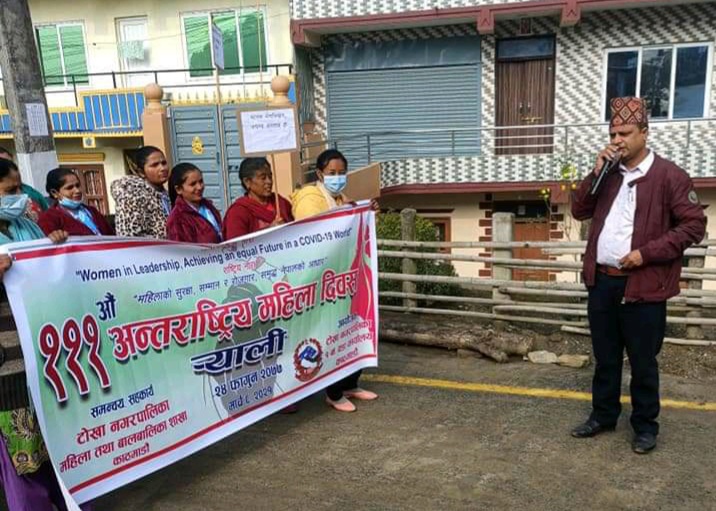 काठमाडौं,फागुन २४ । १ सय ११ औं अन्तर्राष्ट्रिय नारी दिवसको अवसरमा टोखा नगरपालिका वडा नम्बर १ झोरमा विभिन्न महिला संजालले र्याली निकालेका छन । हरेक वर्ष मार्च ८ तारिखका दिन अन्तर्राष्ट्रिय श्रमिक महिला दिवस मनाउने कार्यक्रम अन्तर्गत र्यालीको आयोजना गरिएको टोखा नगरपालिका वडा नम्बर १ कार्यालयले जनाएको छ ।