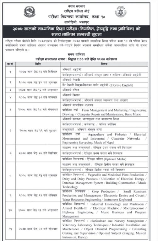 बोर्डले परीक्षा तालिका पनि सार्वजनिक गरको छ। पहिलो दिन जेठ १३ गते अनिवार्य अंग्रेजी विषयको परीक्षा हुनेछ।