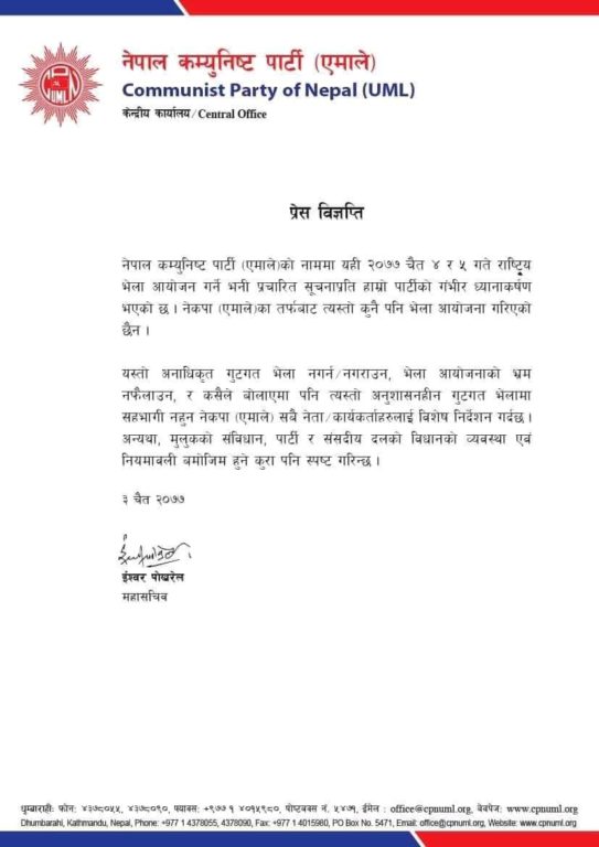 महासचिव पोखरेलले एमालेको नाममा भेला आयोजना गर्ने भनि प्रचारित सूचनाप्रति आफुहरुको गम्भीर ध्यानाकर्षण भएको भन्दै अनाधिकृत गुटगत भेला नगर्न, भेला आयोजनाको भ्रम नफैलाउन र त्यस्तो भेलामा सहभागी नहुन एमालेका सबै नेता तथा कार्यकर्ताहरुलाई विशेष निर्देशन दिएका छन् ।