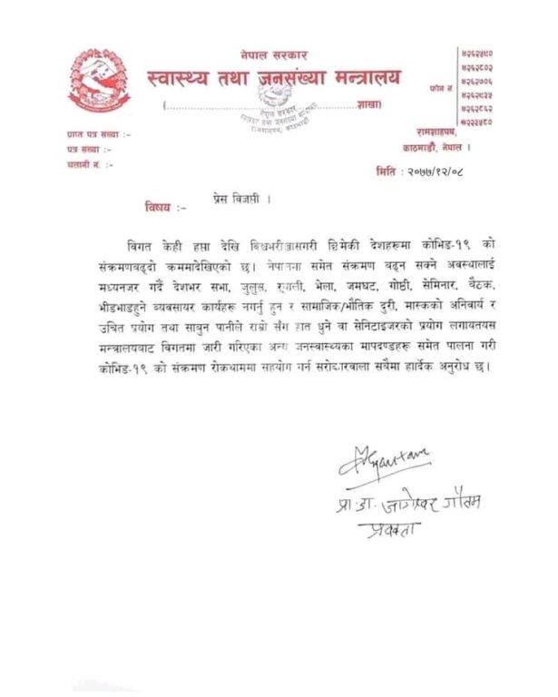 आइतबार एक विज्ञप्ति सार्वजनिक गर्दै स्वास्थ्य मन्त्रालयका प्रवक्ता प्रा.डा. जागेश्वर गौतमले यस्तो अनुरोध गरेका हुन् । विज्ञप्तिमा छिमेकी देश भारतमा देखिएको संक्रमणको त्रास नेपालमा पनि भएकाले सतर्कता अपनाउन अनुरोध गरिएको छ । त्यस्तै मन्त्रालयले सभा, जुलुस, र्याली, भेला, जमघट, गोष्ठी, सेमिनार, बैठक र भीडभाड नगर्न सबैमा अनुरोध गरेको छ ।