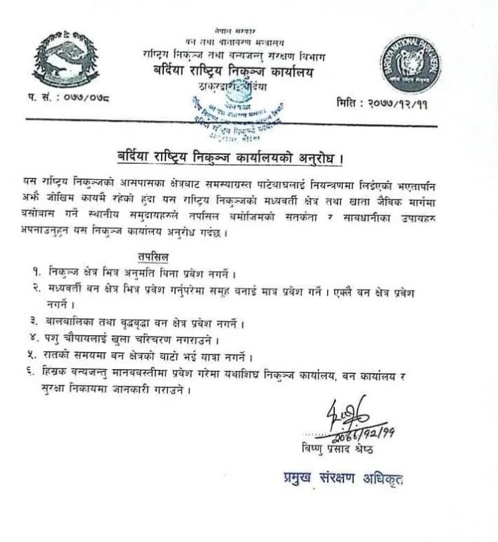यसैबीच बर्दिया राष्ट्रिय निकुञ्जले विज्ञप्ति निकालेर मध्यवर्ती क्षेत्रका स्थानीय बासिन्दालाई अत्यावश्यक कामबाहेक जङ्गलभित्र प्रवेश नगर्न आग्रह गरेको छ । वन क्षेत्रमा बालबालिका र वृद्धालाई प्रवेशमा रोक लगाइएको छ ।