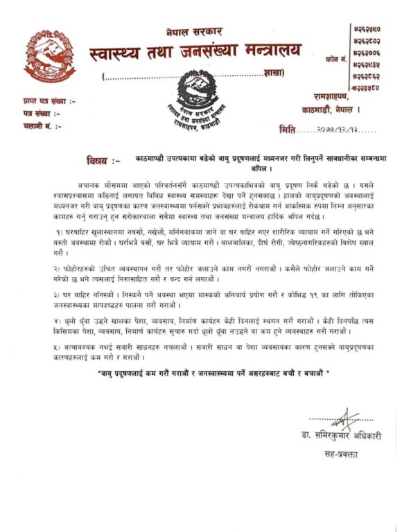 यसैबीच स्वास्थ्य तथा जनसंख्या मन्त्रालयले शुक्रबार एक विज्ञप्ति जारी गर्दै सर्वसाधारणलाई घरबाहिर ननिस्कन आग्रह गरेको हो ।