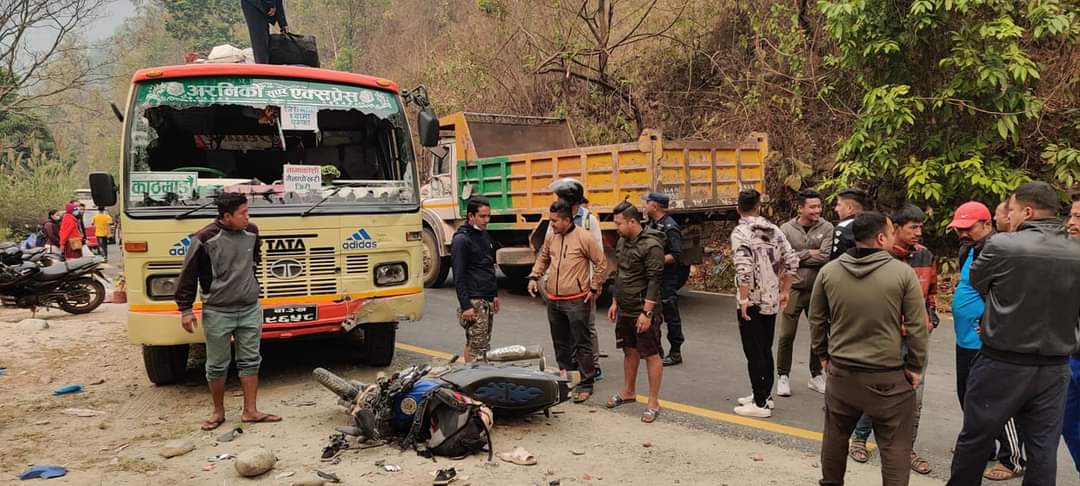 काठमाडौंबाट दोलखा जादै गरेको बा ३ ख ९६५८ नम्बरको अरनिको यातायातको बसले खाडिचौरबाट आउँदै गरेको ६९८७ नम्बरको मोटरसाइकलाई विपिरत दिशामा गएर ठक्कर दिएको थियो । मोटरसाइकलमा सवार अन्य दुईजना घाइते भएका छन् ।