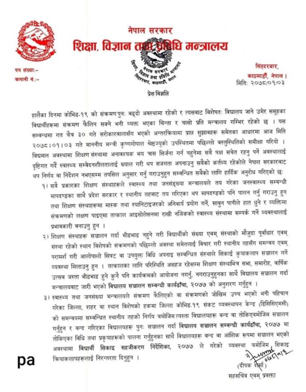 शुक्रबार शिक्षामन्त्री कृष्णगोपाल श्रेष्ठको उपस्थितिमा शैक्षिक जगतको पछिल्लो वस्तुस्थितिबारे समीक्षा गरिएको शिक्षा मन्त्रालयका प्रवक्ता दीपक शर्माले बताए । स्वास्थ्य सवेदनशीलतालाई ख्याल गरी थप सजगता अपनाउन आग्रह गर्दै स्थानीय तहको निर्णय बमोजिम संक्रमण फैलिएको वा जोखिम उच्च भएको भनी पहिचान गरेका जिल्ला, शहर र स्थान विशेषको हकमा विद्यालयहरु बन्द वा तोकिएबमोजिम सञ्चालन गर्न आग्रह गरिएको जानकारी दिए ।