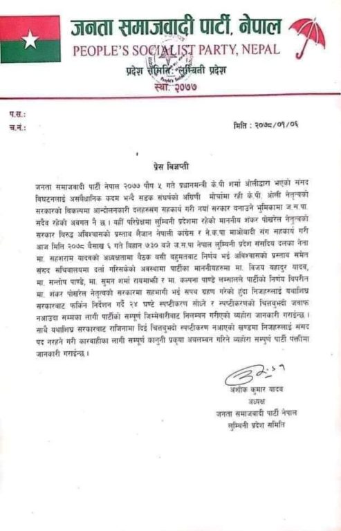जसपाको लुम्बिनी प्रदेश समितिका अध्यक्ष अशोककुमार यादवले सोमबार विज्ञप्ति जारी गर्दै मन्त्री पदको सपथ लिएका विजयबहादुर यादव, सन्तोष पाण्डे, सुमन शर्मा रायमाझी र कल्पना पाण्डे लम्साललाई स्पष्टीकरण सोधेका हुन् । उनले सरकारबाट राजीनामा दिई चित्तबुझ्दो स्पष्टीकरण नदिएमा सांसद पद नरहने गरी कारबाहीका लागि कानुनी प्रक्रिया अवलम्बन गर्नेसमेत बताएका छन् ।