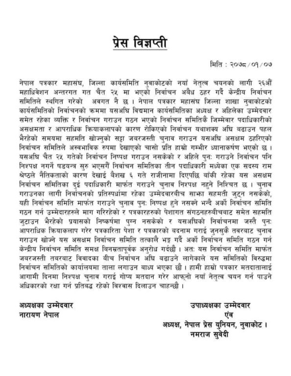 तालाबन्दी पश्चात् बुधबार हुने भनिएको निर्वाचनका उमेदवार तथा प्रेस युनियनका अध्यक्ष नवराज सुवेदी,अध्यक्षका अर्का उमेदवार नारायण नेपाल र महिला उपाध्यक्ष उमेदवार रुपा आर्यालद्वारा संयुक्त हस्ताक्षरित प्रेस बिज्ञप्तीमा नयाँ निर्वाचनका लागि नयाँ निर्वाचन समिति तय गरिनुपर्ने माग राखेका छन् ।