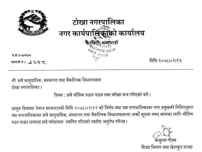 टोखा नगरका विद्यालयमा भौतिक पठनपाठन बन्द