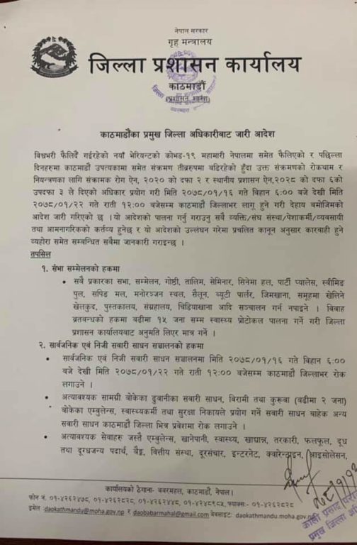काठमाडौसहित उपत्यकामा १६ देखि २२ गतेसम्म लकडाउन