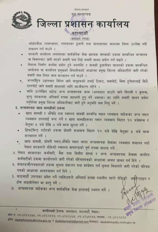 काठमाडौं, वैशाख १३ । काठमाडौसहित उपत्यकामा लकडाउनको घोषणा गरिएको छ । उपत्यकाको तीनै जिल्ला काठमाडौं, ललितपुर र भक्तपुरका प्रमुख जिल्ला अधिकारीहरुले सूचना जारी गरी अत्यावश्यकबाहेकका सेवा र आवागमन निषेध गरिएको जानकारी गराएका हुन् ।