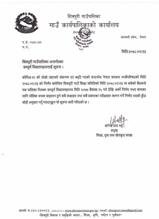 नुवाकोट,वैशाख १४ । जिल्लाको शिवपुरी गाउँपालिकाका सबै विद्यालय यहि वैशाख १५ गते बुधबारदेखि बन्द हुने भएको छ।