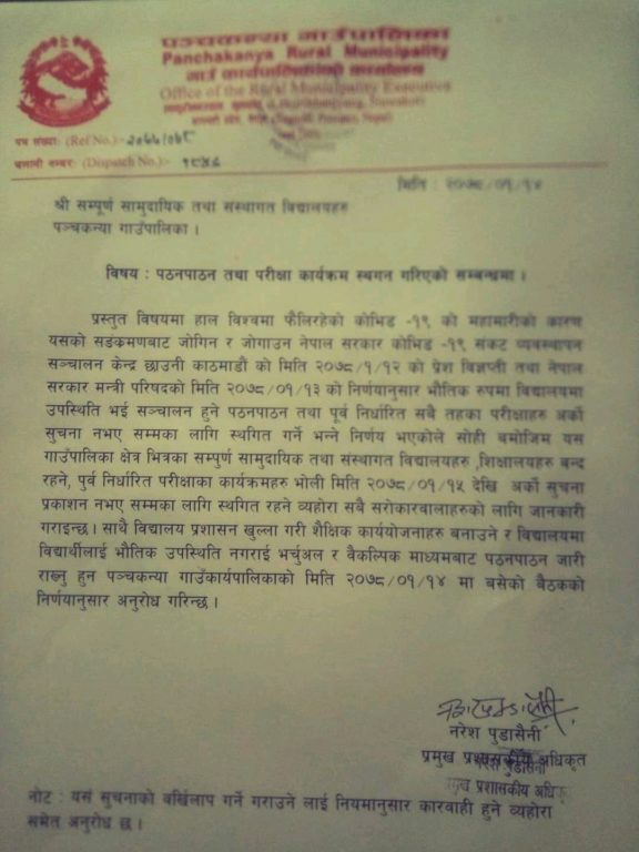 शैक्षिक संस्था बन्दबारे यस्तो आयो पञ्चकन्या गाउँपालिकाको सूचना