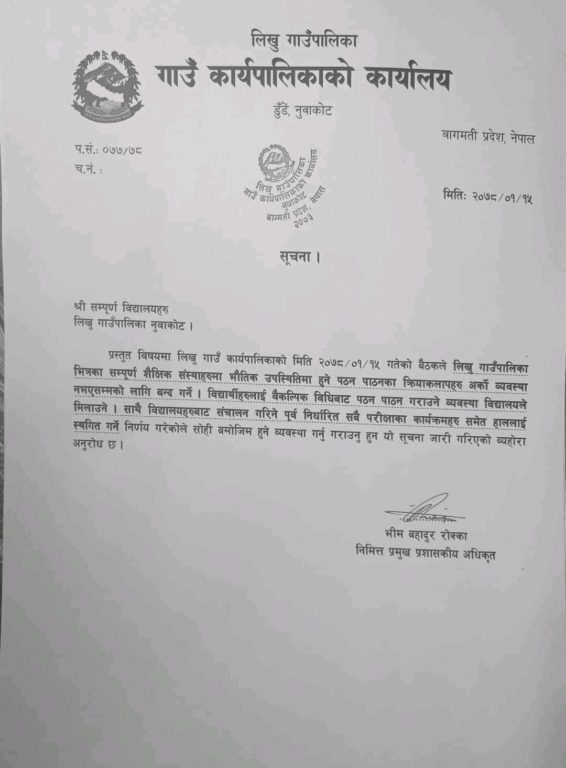 नुवाकोट,वैशाख १५ । जिल्लाको लिखु गाउँपालिका क्षेत्रका सबै विद्यालय यहि वैशाख १५ गते बुधबारदेखि अनिश्चित समयका लागि बन्द भएको छ।