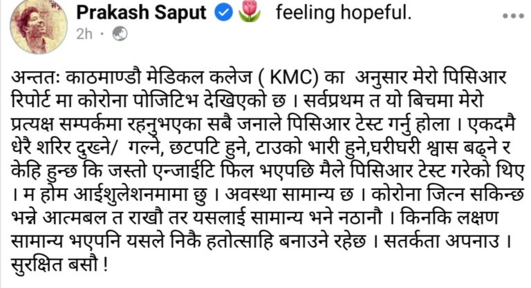 काठमाडौ,वैशाख १७ । चर्चित गायक प्रकाश सपुतलाई कोरोना संक्रमण पुष्टि भएको छ। शुक्रबार सामाजिक संजाल फेसबुक मार्फत आफूलाई कोरोना पुष्टि भएको उनले जानकारी दिए ।