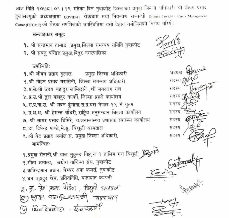 केहि दिन अगाडी मात्रै बसेको बैठकले केहि समय लकडाउन नगर्ने निर्णय गरेको थियो । तर संक्रमितको दर बढ्न थालेको र समुदाय स्तरमा संक्रमण तिब्र गतिमा फैलन थाले पछी जिल्ला संकट ब्यबस्थापन केन्द्र लकडाउन गर्ने स्थितिमा पुगेको हो । यस्तै, बैठकले नुवाकोट भित्रिने सबै नाका कडाई गर्न थालेको छ ।
