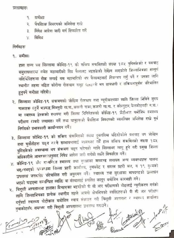 कोभिड १९ जिल्ला संकट ब्यबस्थापन केन्द्रको बैठकले गरेको निर्णयहरु:-