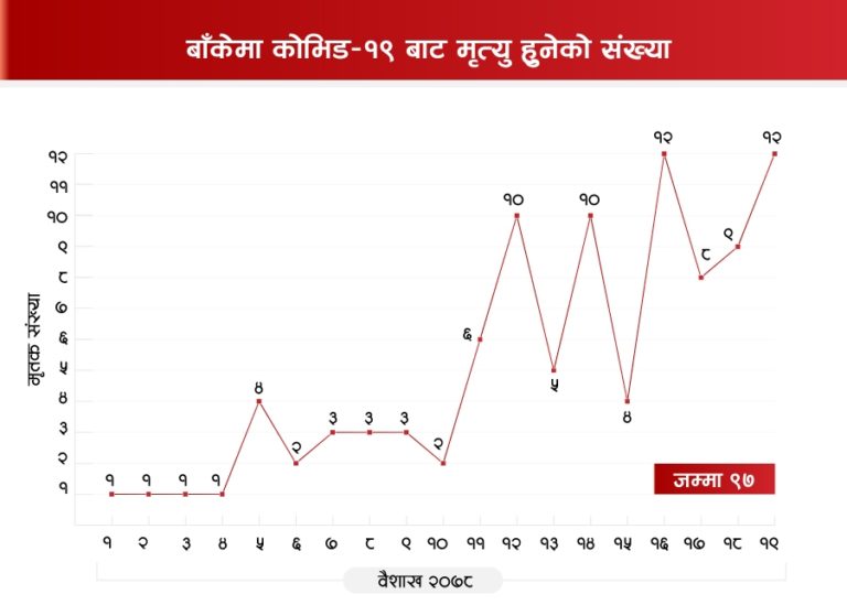 काठमाडौ,वैशाख २० । बाँकेमा कोरोना संक्रमितसंगै मृत्युदर समेत वृद्धि भएको छ। वैशाख यता कोरोना भाइरस संक्रमणबाट बाँकेमा ९७ जनाको मृत्यु भएको छ ।