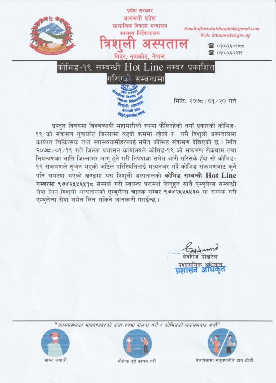 अस्पतालले एक सूचना जारी गर्दै विश्वव्यापी महामारीको रुपमा फैलिरहेको नयाँ प्रकारको कोभिड-१९ को सङ्क्रमण नुवाकोटमा बढ्दो क्रममा रहेको र यसै त्रिशुली अस्पतालमा कार्यरत चिकित्सक तथा स्वास्थ्यकर्मीहरुलाई समेत कोभिड सङ्क्रमण देखिएकाले बढ्दो संक्रमण बीच सेवा पहुँच बढाउन हटलाइन सुरु गरिएको जनाएको छ ।