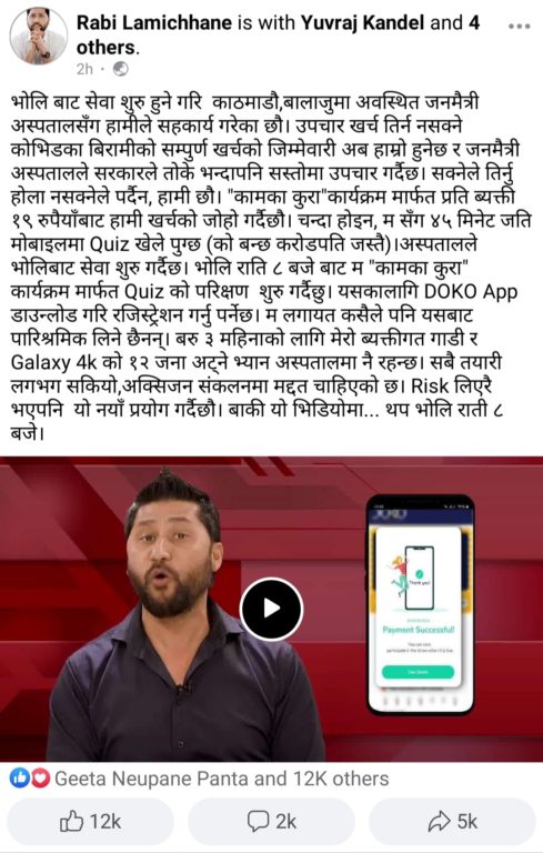 उपचार खर्च तिर्न नसक्ने कोभिडका बिरामीको सम्पुर्ण खर्चको जिम्मेवारी अब हाम्रो हुनेछ र जनमैत्री अस्पतालले सरकारले तोके भन्दापनि सस्तोमा उपचार गर्दैछ। सक्नेले तिर्नु होला नसक्नेले पर्दैन, हामी छौ। “कामका कुरा”कार्यक्रम मार्फत प्रति ब्यक्ती १९ रुपैयाँबाट हामी खर्चको जोहो गर्दैछौ। चन्दा होइन, म सँग ४५ मिनेट जति मोबाइलमा Quiz खेले पुग्छ (को बन्छ करोडपति जस्तै)।अस्पतालले भोलिबाट सेवा शुरु गर्दैछ। भोलि राति ८ बजे बाट म “कामका कुरा” कार्यक्रम मार्फत Quiz को परिक्षण शुरु गर्दैछु। यसकालागि DOKO App डाउन्लोड गरि रजिस्ट्रेशन गर्नु पर्नेछ। म लगायत कसैले पनि यसबाट पारिश्रमिक लिने छैनन्। बरु ३ महिनाको लागि मेरो ब्यक्तीगत गाडी र Galaxy 4k को १२ जना अट्ने भ्यान अस्पतालमा नै रहन्छ। सबै तयारी लगभग सकियो,अक्सिजन संकलनमा मद्दत चाहिएको छ। Risk लिएरै भएपनि यो नयाँ प्रयोग गर्दैछौ।