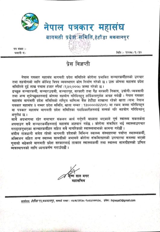महासंघको बिहिवार बसेको जुम मिटिङले कोष स्थापना गरेको हो । कोषमा महासंघ प्रदेश समितिले दुई लाख पचास हजार रुपैयाँ जम्मा गरेको छ । महासंघले कोषमा सहयोग गर्न चाहने सञ्चारकर्मी, सञ्चारमाध्यम, सरकारी तथा गैह्र सरकारी निकाय, ब्यवसायी तथा अन्य शुभेच्छुकहरुलाई नेपाल पत्रकार महासंघ बागमती प्रदेश समितिको राष्ट्रिय बाणिज्य बैंक हेटौंडामा शाखामा रहेको खाता (नामः नेपाल पत्रकार महासंघ ३ नम्बर प्रदेश समिति, खाता नम्बर : १३००००३६६१०१) मा रकम जम्मा गरिदिन आग्रह समेत गरेको छ ।