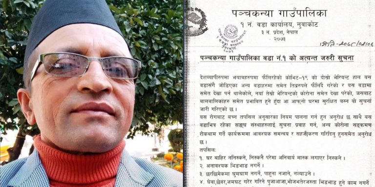 नुवाकोट,जेठ ६ । नयाँ भेरियन्टसहितको कोरोना संक्रमण पञ्चकन्या गाउँपालिका वडा नम्बर १ क्षेत्र फैलिरहेको भन्दै वडा कार्यालयले गाउँवासीलाई सचेत रहन अनुरोध गरेको छ ।