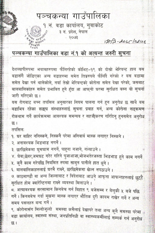 पञ्चकन्या १ कार्यालयको ९ बुँदे अनुरोध, छरछिमेकमा पनि घुम्न नपाइने