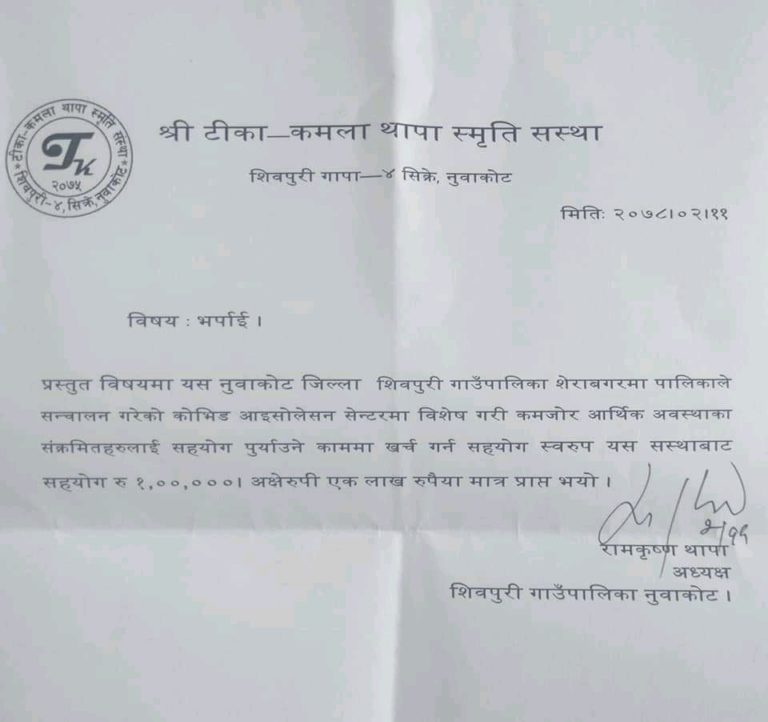 शिवपुरी कोभिड अस्पताललाई टीका-कमला थापा स्मृति कोषबाट आर्थिक सहयोग