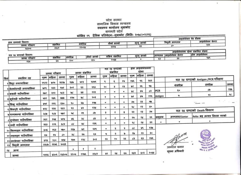 जिल्लामा २४ घण्टा समयावधिमा १६५ जनामा गरिएको परिक्षणमा ६५ जनामा कोरोना पुष्टि भएको थियोे भने १ सय जनाको रिपोर्ट नेगेटिभ पुष्टि भएको जिल्ला स्वास्थ्य कार्यालय नुवाकोटले जनाएको छ।