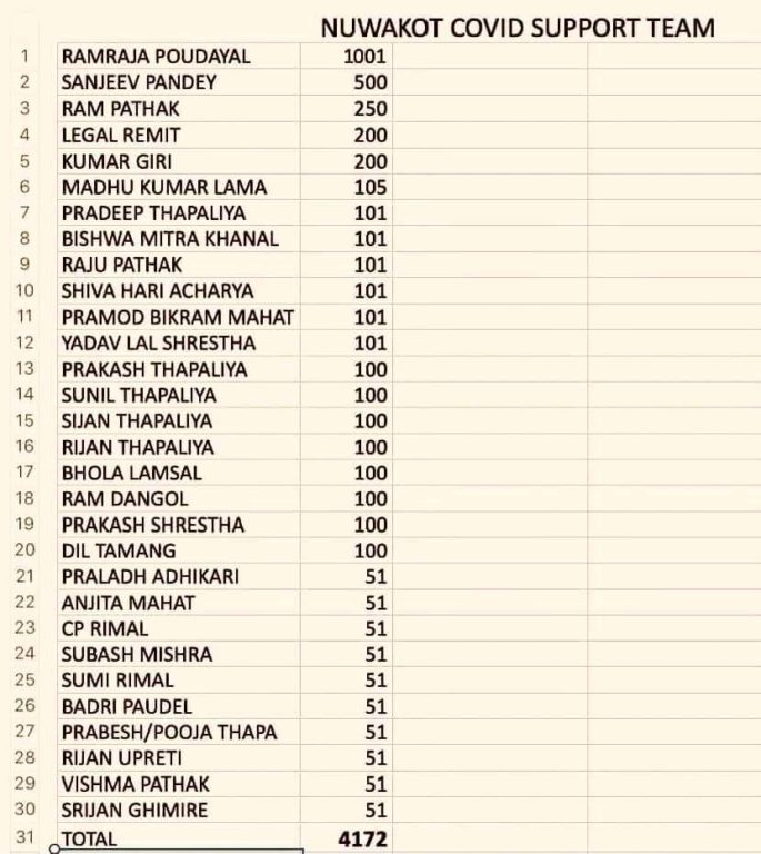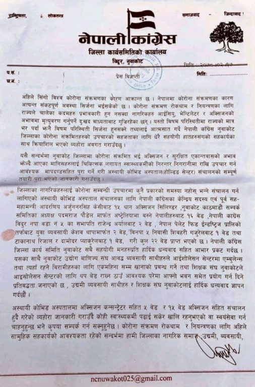 अहिले सिंगो बिश्व कोरोना संक्रमणका कारण आक्रान्त छ । नेपालमा कोरोना संक्रमणका कारण अत्यन्त संकटपूर्ण अवस्था सिर्जना भईसकेको छ । कोरोना संक्रमण रोकथाम र नियन्त्रणका लागि राज्यले चालेका कदमहरु प्रभावकारी हुन नसक्दा नागरिकहरु आईसियु, भेन्टिलेटर र अक्सिजनको अभावमा मृत्युवरण गर्नुपर्ने दुःखद बाध्यताबाट गुज्रिरहेका छन् । यस्तो बिषम परिस्थितीमा राज्यको मात्र भर पर्दा झनै बिषम परिस्थिती सिर्जना हुनसक्ने तथ्यलाई आत्मसात गर्दे नेपाली काँग्रेस नुवाकोट जिल्लाका कोरोना संक्रमितहरुको उपचारको सहजताका लागि धेरै सहयोगी हातहरुसंगको सहकार्यका साथ क्रियाशिल भएको व्यहोरा अवगत गराउँदछु ।