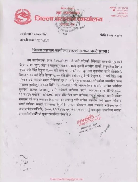 दाङ,जेठ २० । नदीजन्य पदार्थ व्यवस्थापन सम्बन्धी जिल्ला कोभिड संकट व्यवस्थापन केन्द्र दाङले गत जेठ १४ गते गरेको निर्णय ५ दिन पछि फिर्ता लिएको छ । जिल्ला प्रशासन कार्यालय दाङले बिहीबार सार्वजनिक सूचना प्रकाशित गरि लुम्बिनी प्रदेशको नदीजन्य पदार्थ व्यवस्थापन कार्यविधि २०७५ को दफा १३(१) (ङ) बमोजिम तोकिएको समय सीमाभित्र मात्र नदीजन्य पदार्थ बोकेको सवारी साधनहरू सञ्चालन गर्न तथा चलाउन दिनु, चलाउन लगाउनु भनेको छ ।