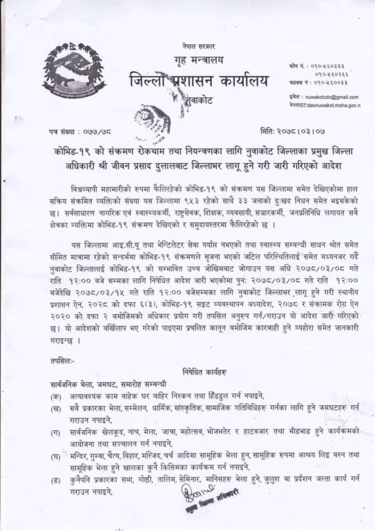 नुवाकोट,असार ७ । नुवाकोटमा असार १५ गतेसम्म निषेधाज्ञा थपिएको छ ।