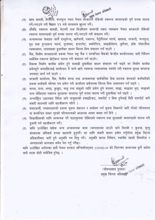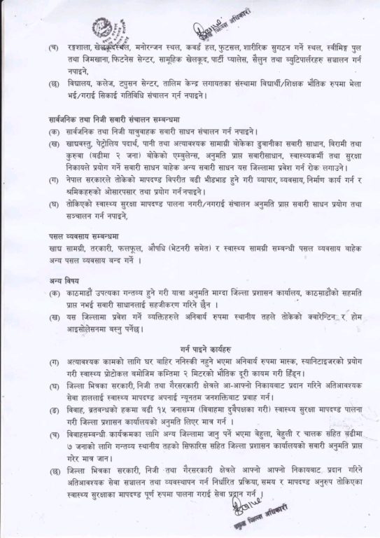निर्णय अनुसार अत्यावश्यक काम बाहेक कुनै पनि व्यक्ति घर बाहिर निस्कन नपाउने, नेपाल सरकारद्वारा तोकिएको सामाजिक दूरी, स्वास्थ्य सुरक्षा मापदण्डको अनिवार्य पालना गर्ने, बजार, मेला, महोत्सव, पार्टी, भोज, भतेर लगायतका भिडभाड हुने कार्य नगर्ने नगराउने र कोभिड–१९ को लक्षण देखिएमा वा त्यस्तै प्रकारका अन्य कुनै स्वास्थ्य समस्या देखिएमा तुरुन्तै नजिकको स्वास्थ्य संस्था वा स्थानीय तहमा सम्पर्क राख्नु पर्नेछ ।
