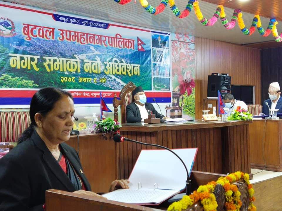 बुट्वल,असार १०। बुटवल उपमहानगरपालिकाको नगर सभाको नवौं अधिवेशनमा आगामी आवका लागि बजेट प्रस्तुत भएको छ । प्रमुख शिवराज सुवेदीको अध्यक्षतामा बसेको नगरसभाको नवौं अधिवेशनमा योजना तर्जुमा समितिका संयोजक समेत रहनुभएका उपप्रमुख गुमादेवी आचार्यले आगामी आव २०७८/०७९ का लागि २ अर्ब ५३ करोड २ लाख ४५ हजार ७ सय १० रुपैयाँ बराबरको बजेट प्रस्तुत गर्नुभएको हो ।