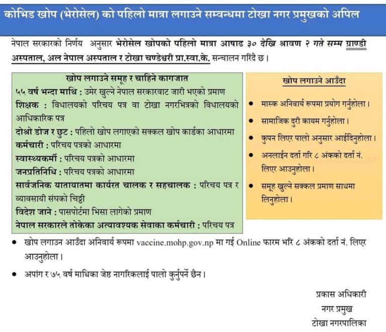 खोपका लागि पहिचान खुल्ने सम्बन्धित परिचयपत्रका साथ उपस्थित हुन शाखाले अनुरोध गरेको छ।