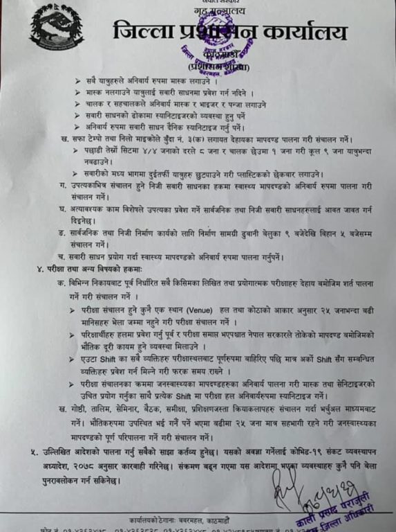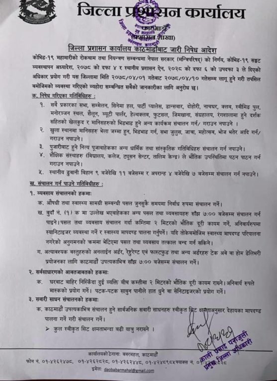 भक्तपुरका प्रमुख जिल्ला अधिकारी प्रेमप्रसाद भटटराईका अनुसार थप निषेधाज्ञा अवधिमा लामो दूरीका सार्वजनिक यातायात सम्बन्धित जिल्ला प्रशासनको पास बनाएर काठमाडौं आउन पाउने भएका छन् । यसअघि नै काठमाडौं उपत्यकामा सार्वजनिक यातायात जोरबिजोर प्रणालीको नियम हटाई सकिएको छ । यातायात सञ्चालन गर्दा जनस्वास्थ्यका मापदण्ड अनिवार्य पालना गर्नुपर्ने छ ।