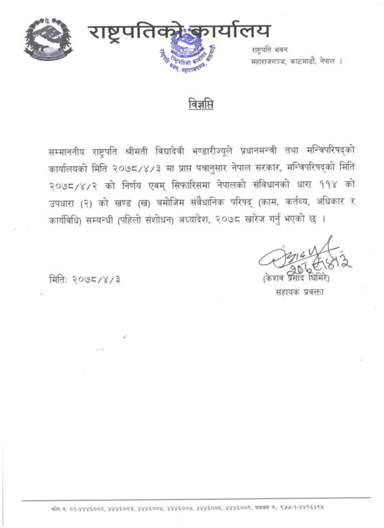 प्रधानमन्त्री तथा मन्त्रिपरिषद्को कार्यालयको आइतबार प्राप्त पत्र अनुसार राष्ट्रपति भण्डारीले नेपाल सरकार, मन्त्रिपरिषद्को साउन २ गतेको निर्णय एवं सिफारिसमा नेपालको संविधानको धारा ११४ को उपधारा (२) को खण्ड (ख) बमोजिम संवैधानिक परिषद् सम्बन्धी (पहिलो संशोधन) अध्यादेश, २०७८ खारेज गरेको राष्ट्रपतिको कार्यालयद्वारा जारी विज्ञप्तिमार्फत जनाइएको छ ।
