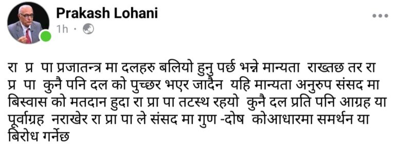 बुधबार सामाजिक सञ्जालार्फत नेता लोहनीले राप्रपा प्रजातन्त्रमा दलहरु बलियो हुनुपर्छ भन्ने मान्यता राख्ने मुख्य पार्टी भएकालेे कुनै पनि दलको पछि लागेर पुच्छर नबन्ने बताएका हुन् । सोही गुणका आधारमा संसदमा विश्वासको मत सन्दर्भमा नखुलेको समेत स्पष्ट पारेका छन् ।