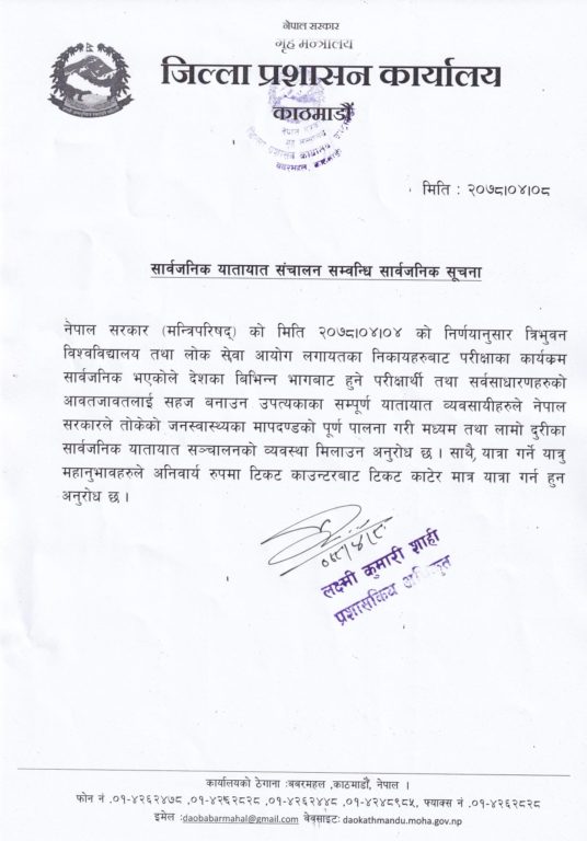 शुक्रबार आदेश जारी गर्दै काठमाडौं जिल्ला प्रशासनले लोकसेवा र विश्वविद्यालयका परिक्षार्थीको आवागमनलाई मध्यनजर गर्दै यस्तो निर्णय गरेको हो । काठमाडौंका प्रजिअ कालिप्रसाद पराजुलीले शनिबारदेखि लागू हुने गरी लामो तथा मध्यम दूरीका यातायात खुलाउन आदेश जारी भएको बताए ।