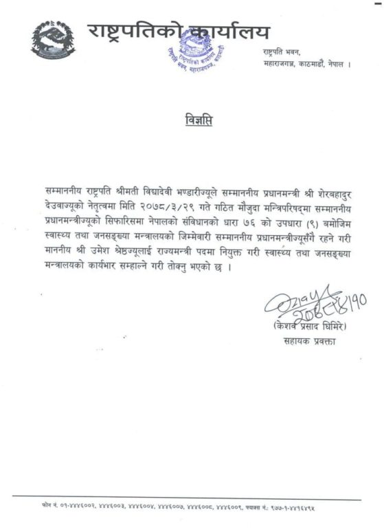 प्रधानमन्त्री शेरबहादुर देउवाले स्वास्थ्य मन्त्रालयको जिम्मेवारी आफूसँगै रहने गरी आइतबार श्रेष्ठलाई राज्य मन्त्री नियुक्त गरी मन्त्रालयको कार्यभार सम्हाल्ने गरी तोकेको राष्ट्रपति कार्यालयले जनाएको छ ।